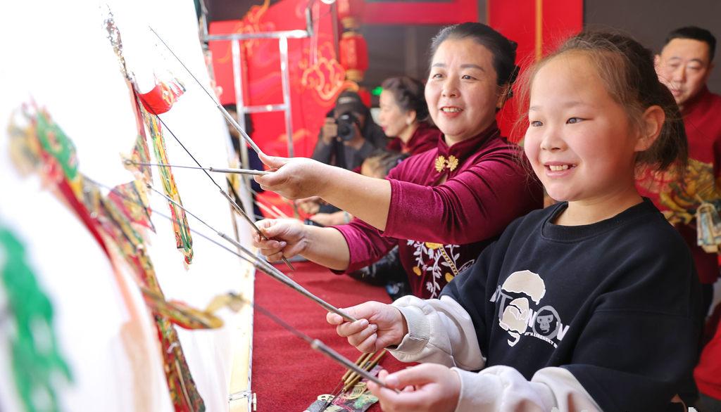 1月31日,民間藝人在秦皇島博物館帶領小朋友體驗皮影。