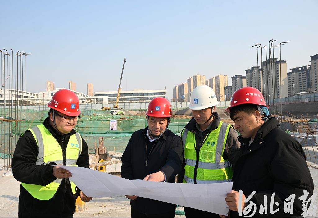 2月27日,正定縣塔元莊村黨委書記、村委會主任尹計平(左二)在康養(yǎng)項目建設(shè)工地,了解施工情況。河北日報記者史晟全攝