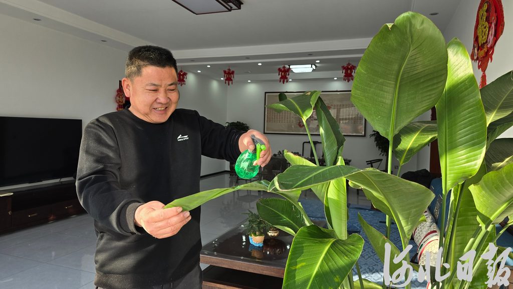 2月27日,涿州市刁窩鎮(zhèn)萬全莊村村民付繼軍正在新房里為花草噴水。河北日報記者林鳳斌攝