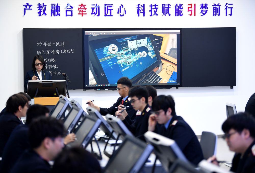2022年4月29日,在西安鐵路職業技術學院,學生在動車組VR智慧課堂上模擬檢修。近年來,我國著力促進教育公平,提升教育質量,加快推進教育現代化,教育數字化工作持續推進、成果豐碩。
