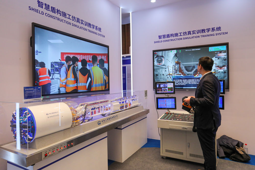 2024年1月30日,工作人員在上海舉辦的“數智未來”教育展上演示智慧盾構施工仿真實訓教學系統。2024世界數字教育大會以“數字教育:應用、共享、創新”為主題,圍繞教師數字素養與勝任力提升、數字化與學習型社會建設、數字教育評價、人工智能與數字倫理、數字變革對基礎教育的挑戰與機遇、教育治理數字化與數字教育治理等議題展開討論。