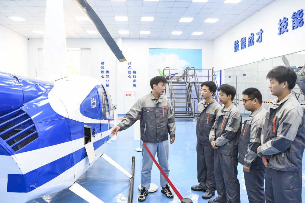 2024年9月25日,重慶城市職業學院航空學院教師(左一)在為學生們講解直升機繞機檢查的注意事項。近年來,重慶市永川區依托現代制造業基地和西部職教基地優勢,推動低空產業領域的校企合作、產教融合,布局發展低空制造、低空管理、低空應用等低空經濟產業,助推經濟高質量發展。