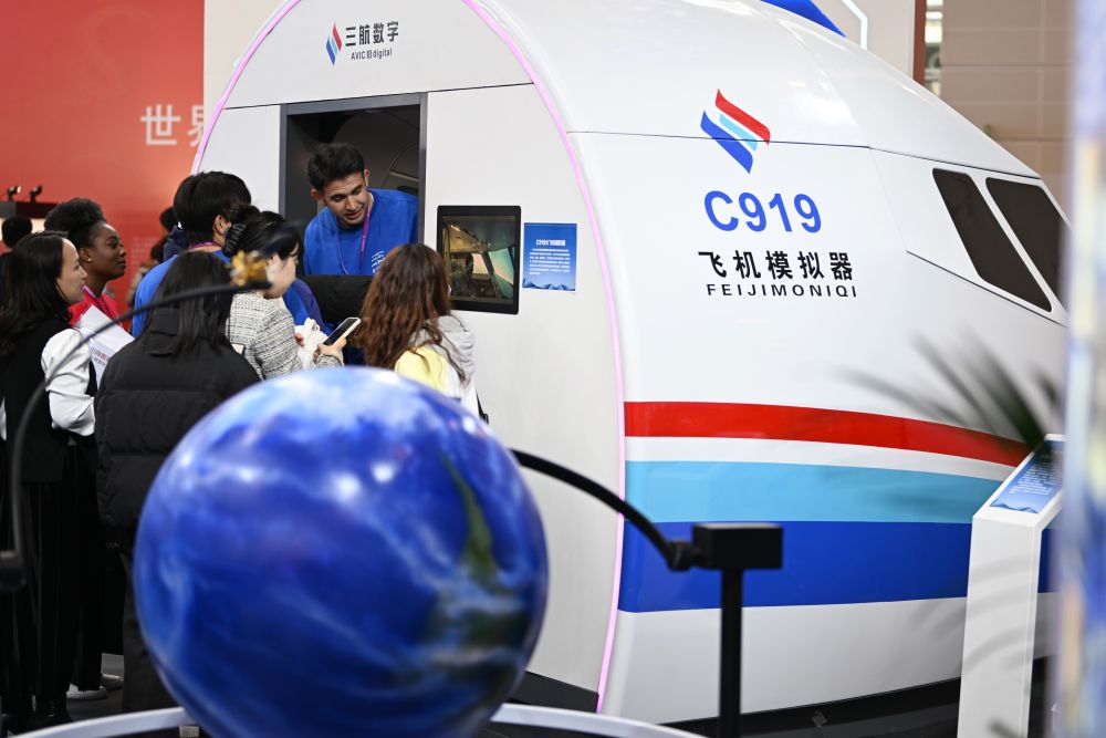 2024年11月21日,參會者在天津舉行的世界職業技術教育發展大會專題展上參觀C919飛機模擬器。展覽設置了技能塑造人生、技藝傳承文明、服務產業升級、國際交流合作、產教互融互通等7個板塊,全方位展示職業教育改革發展成果。