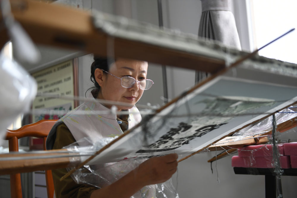 2023年9月8日,陜西千陽繡娘王紅燕在西秦刺繡文化產業園內刺繡。陜西千陽縣是國家級非物質文化遺產“西秦刺繡”的重要發祥地和傳承地。近年來,千陽縣將西秦刺繡作為助農增收的重要產業,推動非遺項目產業化發展,助力鄉村振興。
