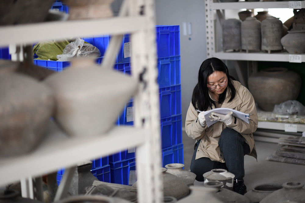 2024年3月5日,陜西省考古研究院女子考古隊隊員張佳楊在文物庫房登記文物信息。成立于2020年的女子考古隊先后完成包括蔣劉仰韶晚期環壕聚落、大堡子西漢陵邑墓地等重要發現在內的基本建設考古項目數十項。