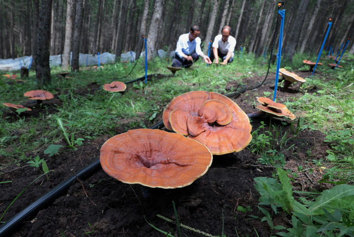7月27日,圍場縣哈里哈鎮一家靈芝培育合作社的技術員在林間管護靈芝。新華社記者 楊世堯 攝