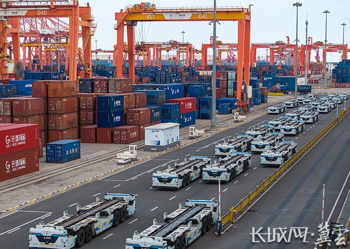 唐山港京唐港區集裝箱碼頭堆場上智能平板運輸車整裝待發。趙杰 攝